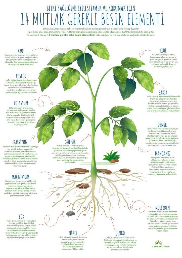 Azot (N): Ekinin kök, gövde, sürgün, dal, meyve gelişimi için önemli rol oynuyor. Özellikle gelişim döneminde ekinlerin azot ihtiyacı artıyor. Toprakta azot eksik olduğunda kök gelişimi düşük olduğundan büyüme hızı da yavaşlıyor. Yetersiz gelişim; ekin yapraklarının küçülmesi, dökülmesi ve sürgün verememesi ile anlaşılabiliyor.